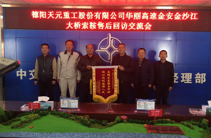 在本次售后回訪過程中,汪總一行受到了中交華麗高速公路第三項目經理部有關領導的熱情接待,雙方就項目合作過程中的一些重要事項交換了看法,總結了經驗教訓,增進了雙方的互信,為今后展開進一步合作奠定了基礎。為了感謝天元重工在本次項目合作工作中給予的鼎力支持,中交華麗高速公路第三項目經理部特別制作了錦旗贈送給汪總一行,共同期盼“同心同創(chuàng)造福人民,至精至善服務華麗”。